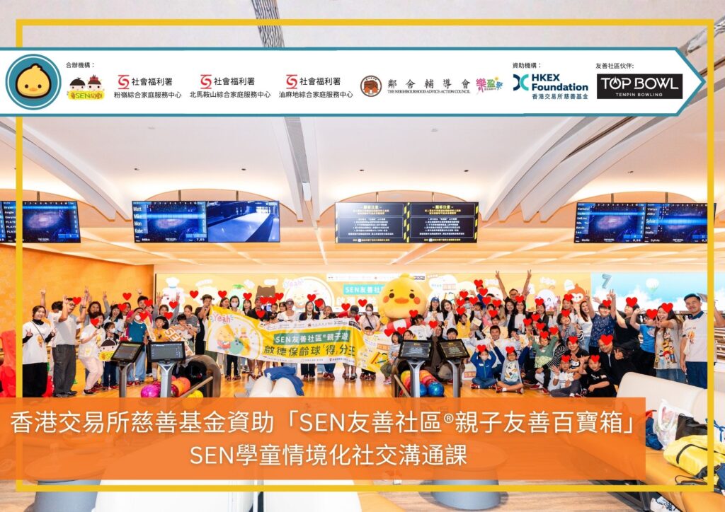 香港交易所慈善基金資助「SEN友善社區®親子友善百寶箱」 【童SEN同戲 x 鄰舍輔導會樂盈聚 家長資源中心 x 社會福利署北馬鞍山綜合家庭服務中心 x 社會福利署油麻地綜合家庭服務中心 x 社會福利署粉嶺綜合家庭服務中心 x Top Bowl Tenpin Bowling】 情境化⼾外親⼦社交溝通課|鳴謝商界支持
