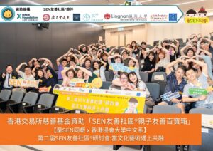 感謝香港交易所慈善基金資助,童SEN同戲開展「SEN友善社區®親⼦友善百寶箱」服務計劃。為推動SEN友善社區®在各行業之間落地生根,童SEN同戲與香港浸會大學中文系合辦「第二届SEN友善社區®研討會:當藝術文化遇上共融」,連同高端精品品牌管理、特殊教育需要樂器演奏、表達藝術治療、共融舞蹈等資深行業領導者,融合藝術文化行業情境,拓展至SEN友善社區®友善意識(SENSE)、友善流程(STEPS)及友善教材(SOURCE)三大主題,在大學的友善空間(SPACE)提升社區友善度,讓有特殊教育需要學童及家庭從社區中學習、從社區中成長的友善體驗,加強學童與社區連接。