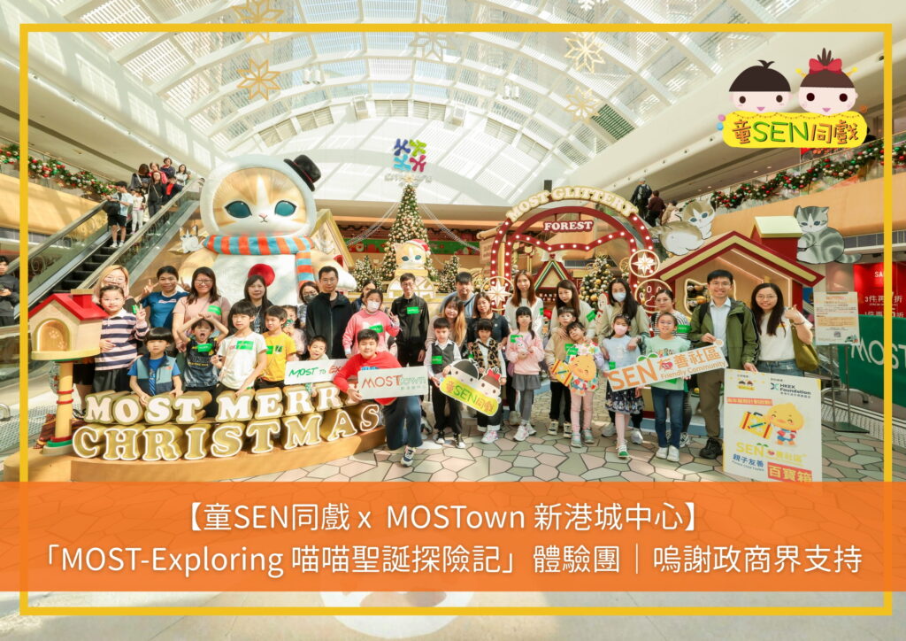 感謝 MOSTown新港城中心 支持童SEN同戲,推動SEN友善社區®在馬鞍山區的商場落地生根。隨著香港交易所慈善基金資助「SEN友善社區®親⼦友善百寶箱」服務計劃的展開,凝聚了一群區内熱心的友善協作伙伴及家庭,今次連同政府服務單位社會福利署 北馬鞍山綜合家庭服務中心共同招募30組家庭,延續計劃課程内容至外遊活動,融合馬鞍山區兒童熟悉的社區情境,提升不同能力的兒童及照顧者從社區中學習、從社區中成長的友善體驗,加強學童與社區連結。