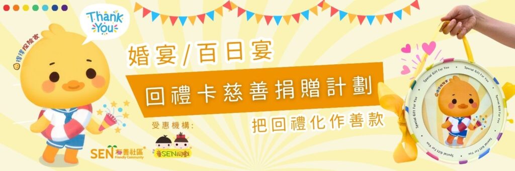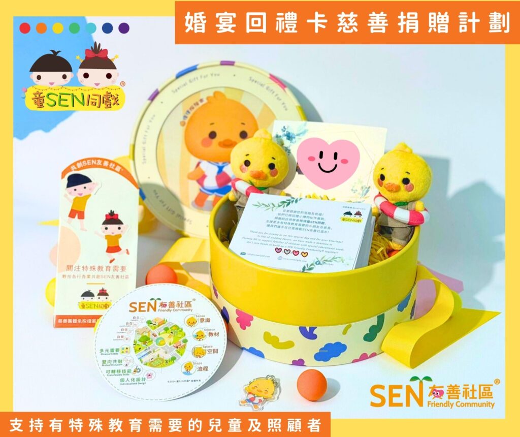將婚宴/百日宴之回禮化作善款,支援有特殊教育需要的兒童及家長,包括進行跨情境學習計劃、SEN友善親子共讀服務、SEN友善社區®倡議服務等,邀請您攜手共創SEN友善社區®,為祝福增添意義。