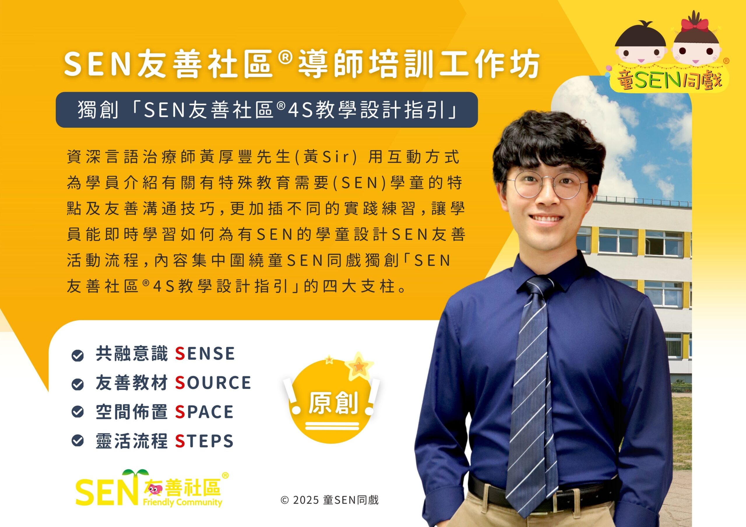 資深言語治療師黃厚豐先生(黃Sir) 用互動方式為導師介紹有關有特殊教育需要(SEN)學童的特點及友善溝通技巧,更加插不同的實踐練習,讓學員能即時學習如何為有SEN的學童設計SEN友善活動流程,內容集中圍繞童SEN同戲獨創「SEN友善社區®教學設計指引」的四大支柱中的「SENSE 共融意識」、「SOURCE 友善教材」、「SPACE 空間佈置」及「STEPS 靈活流程」。